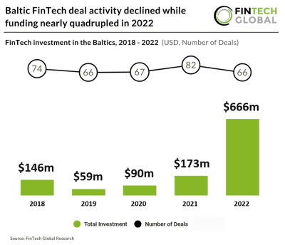 The Baltics reported nearly a 4x increase in fintech investment in 2022, anchored by three $100m deals, demonstrating increasing development and maturity of the ecosystem.