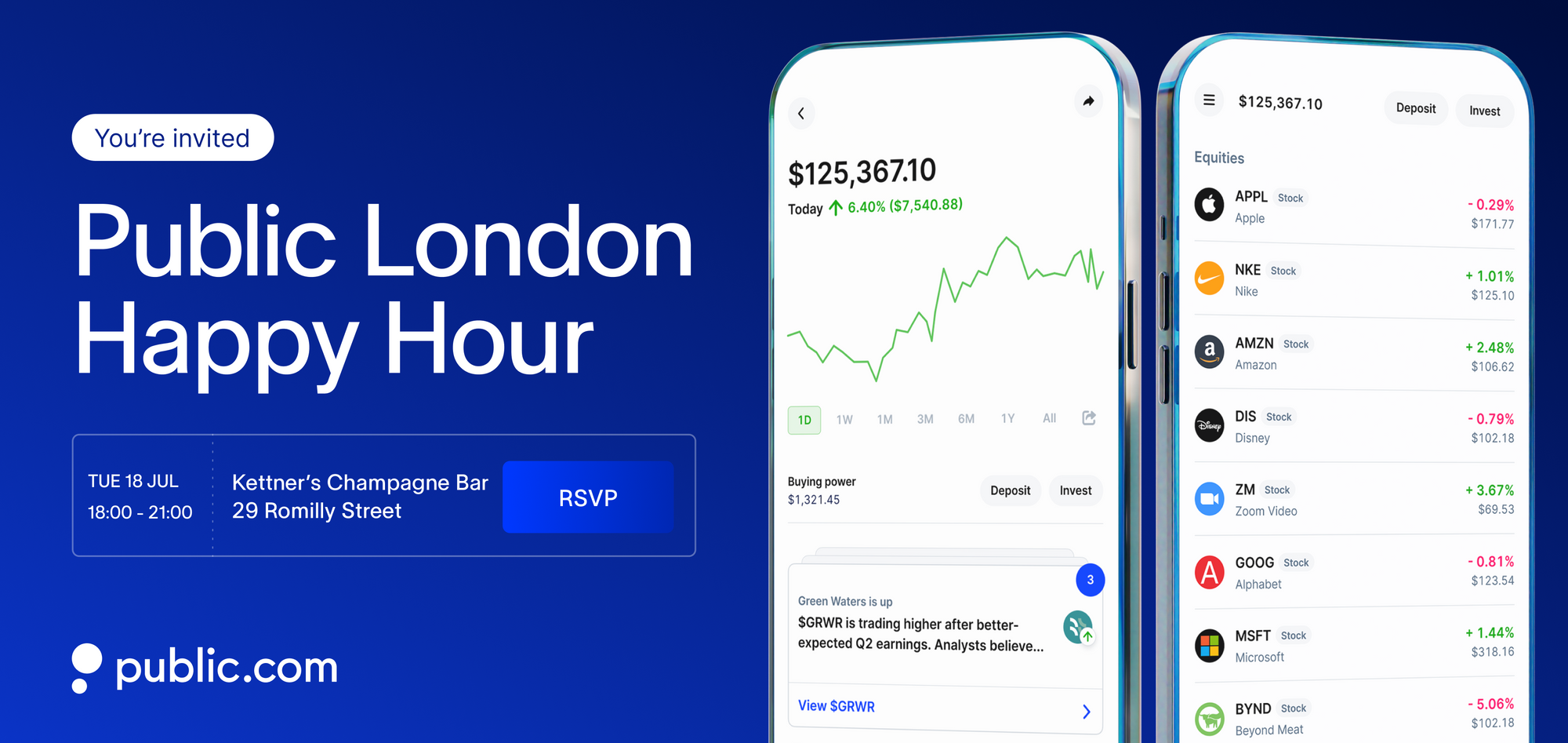 You’re invited to join Public.com tomorrow evening in celebration of their United Kingdom launch. Join CEO Leif Abraham and COO Stephen Sikes to learn more about Public’s investing platform, whilst meeting others in the London fintech community.