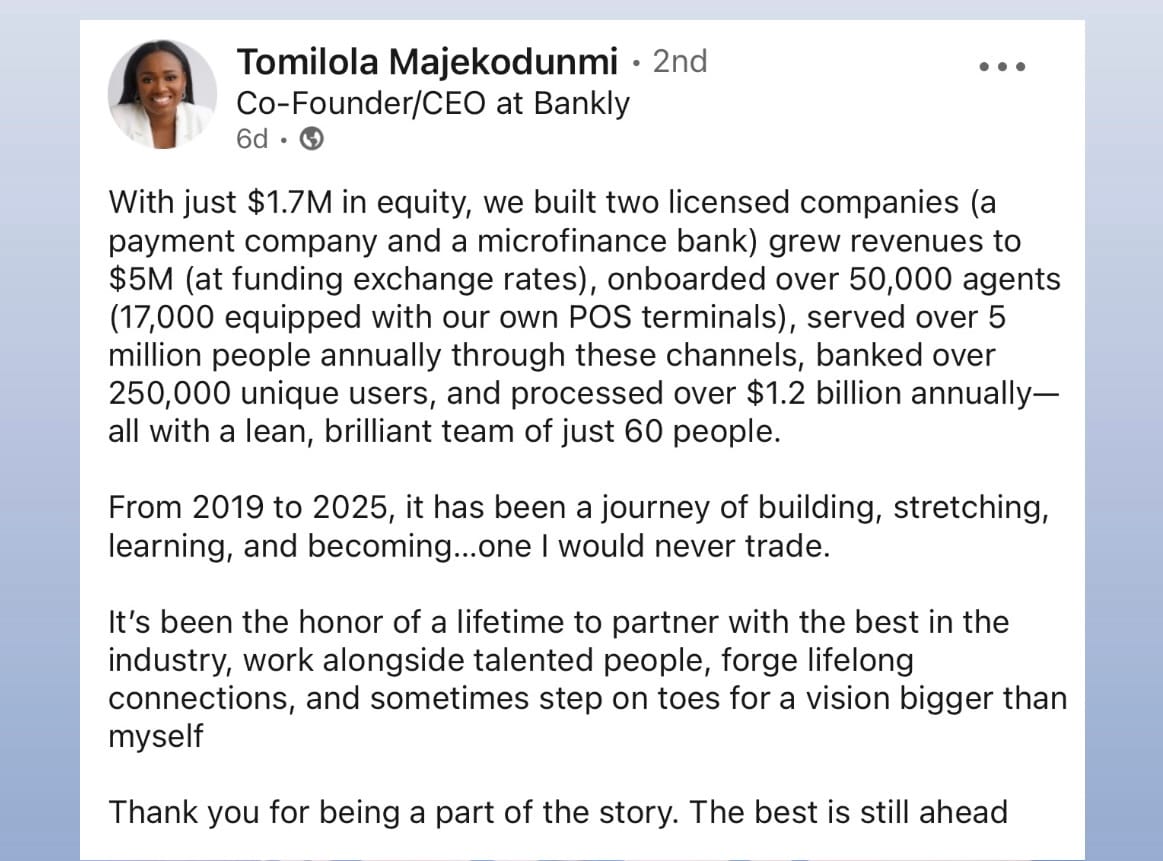 • What does it take for your fintech to be acquired by an investment firm? Tomilola, whose fintech Bankly was acquired by C-One Ventures, shared a blueprint.