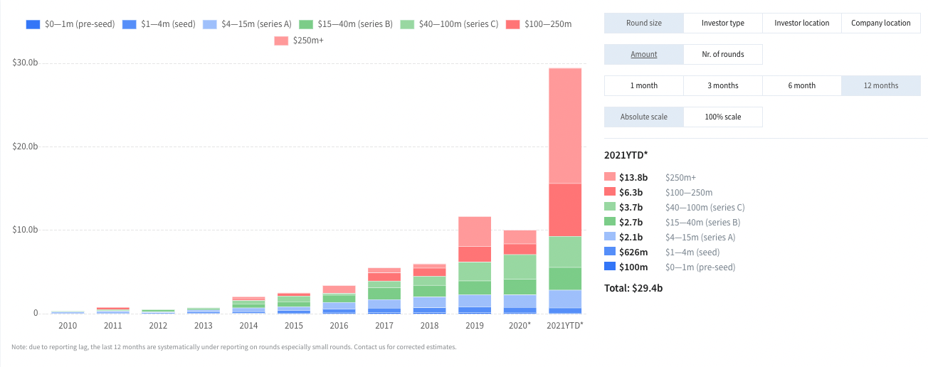 UK & Europe fintech’s have raised a record amount in 2021, nearly $30bn across nearly 1,250 deals which is a fantastic achievement. This amount however was not evenly spread, with the UK is still the dominant fintech ecosystem in Europe. European fintechs did maintained their share of global fintech investment which has averaged ~23% over the past 3 years.