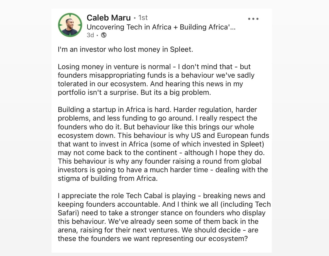 While the misappropriation of funds by founders happens globally, not just in Africa, I would love to hear your thoughts on its impact on the African tech ecosystem. write your comments, which I will publish in next week’s newsletter.