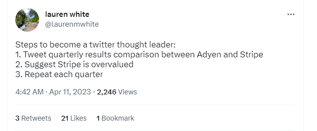 Now that these two headline-grabbing events are in the rearview mirror, Stripe is buckling itself back into the drivers’ seat about their own narrative, and published their annual letter this past week. Outside analysts, of course, have been twisting themselves into quantitative pretzels assessing Stripe’s financials from the tea leaves (see: All In Podcast episode 117, associated follow ups). These analysts generally attempt to triangulate comparisons like Stripe’s would-be valuation using the only realistic competitor in the space - Adyen. For comparison, here is Adyen’s annual letter, which, as of this writing, was only mentioned a couple times on Twitter, a sharp contrast from the RT party regarding Stripe’s letter.