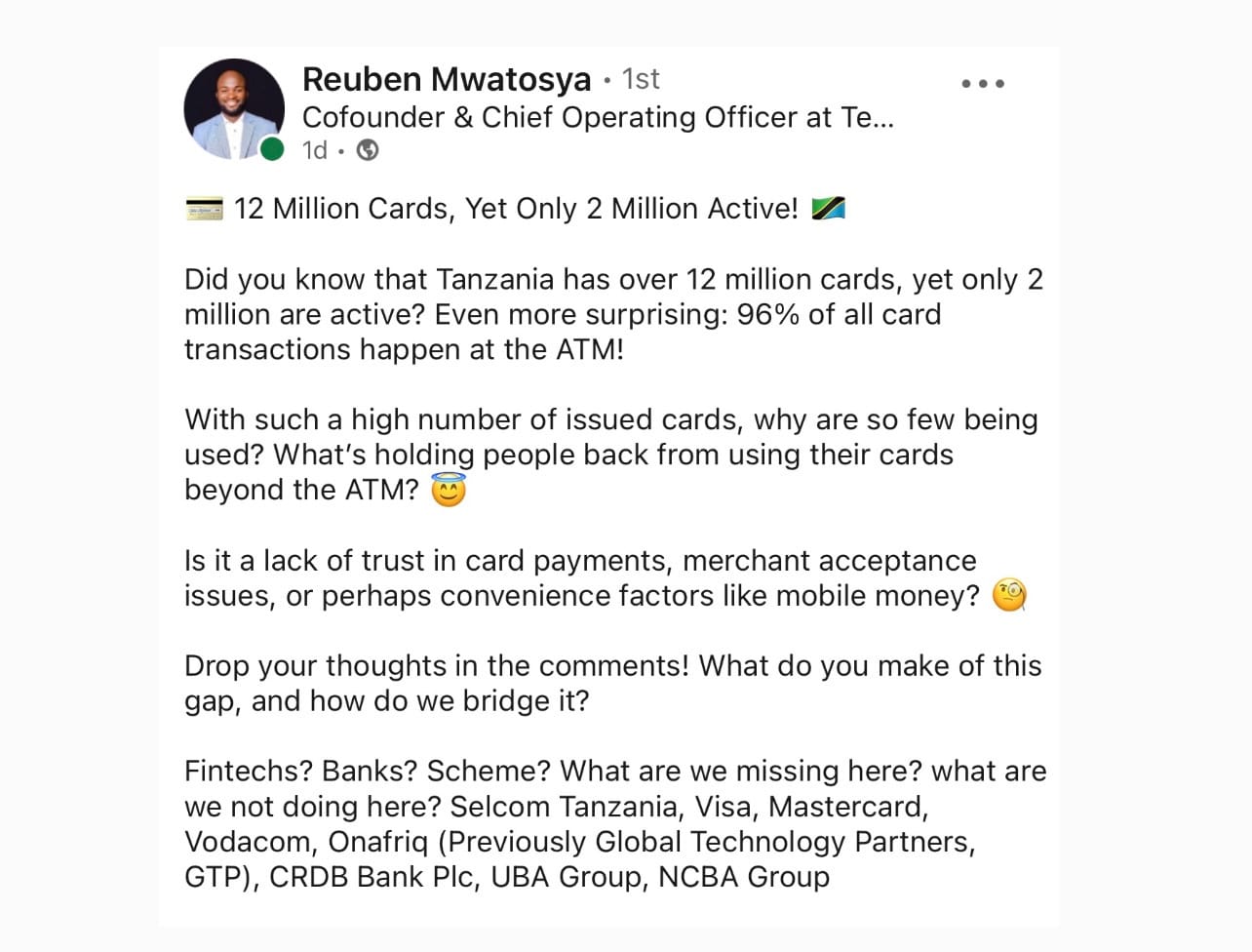 • In Tanzania, a country of 60 million people, there are 12 million cards, but only 2 million are active.