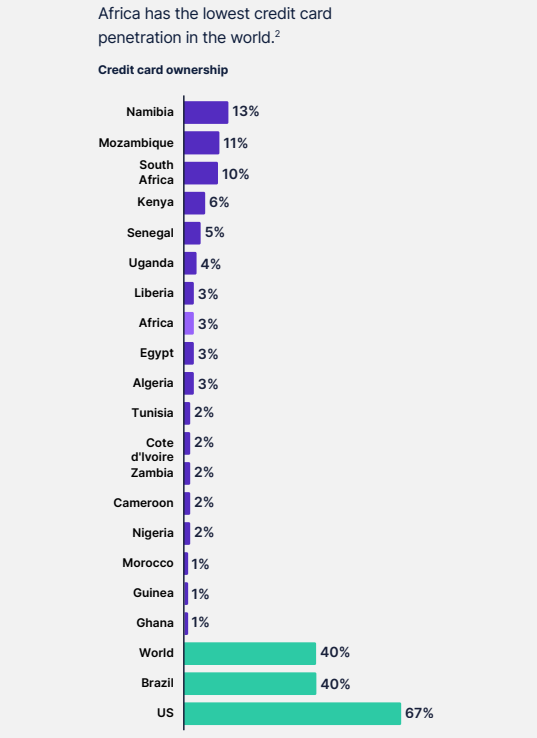• Only 3% of Africans own credit cards, the lowest credit card penetration rate of any region worldwide.