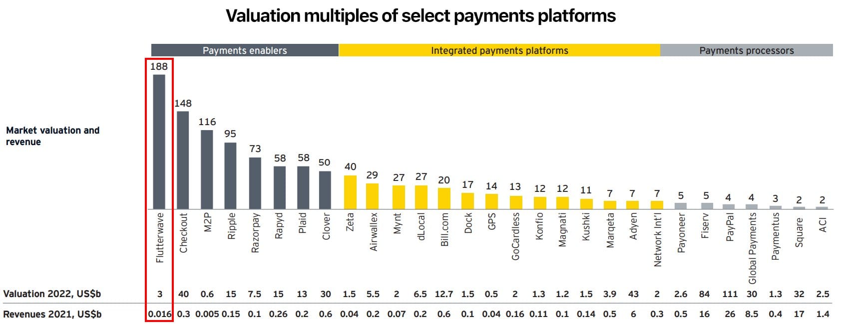 The 2022 valuation multiples of some global payments platforms.Of all the companies listed, Flutterwave had the highest valuation relative to revenue generated.