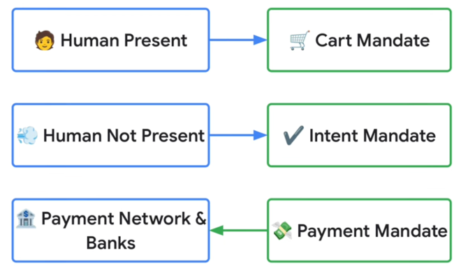 For example, a “human present” flow might provide an agent with a human-signed “Intent Mandate” to go find an item. Once the agent finds the item, it can present the human with a “Cart Mandate” to complete the purchase on their own. For a delegated task, the agent might proceed with both an “Intent Mandate” and “Cart Mandate” at the outset without the need for including a human in the loop.