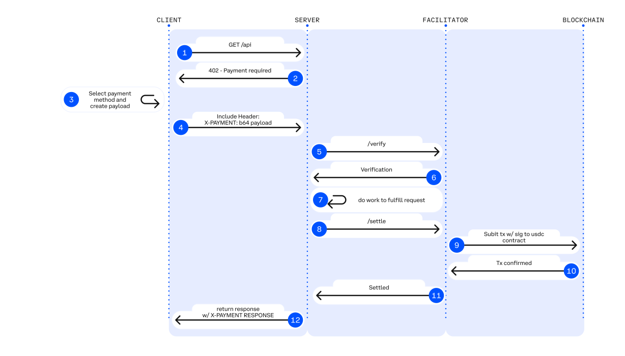 x402, led by Coinbase and launched in May 2025, treats payments as a native part of the web by reviving the HTTP 402 “Payment Required” status code. The way it works is somewhat simple: When an agent makes a request, the server can respond with a 402 and a machine-readable "offer" (price, currency, terms) that the agent theoretically responds to before continuing. The idea is that rather than having to top-up an account and manage access and billing for every API an agent needs to access, the agent can complete each request as a “microtransaction” with its own crypto wallet.