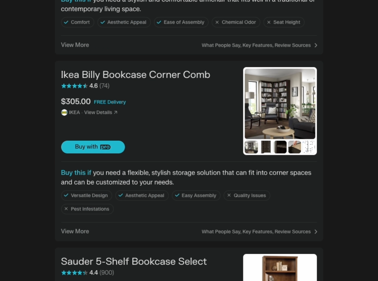 Earlier this month, Perplexity launched a revamp of its “Shopping” experience, allowing customers to purchase from partner merchants without leaving the Perplexity app. The lines here are a bit more blurred between “Search” and “AI”, but it seems to do a good job of aggregating and summarizing reviews from across the web. Very few of the items they list support the “Buy with Pro” functionality, but we can expect more to onboard soon.
