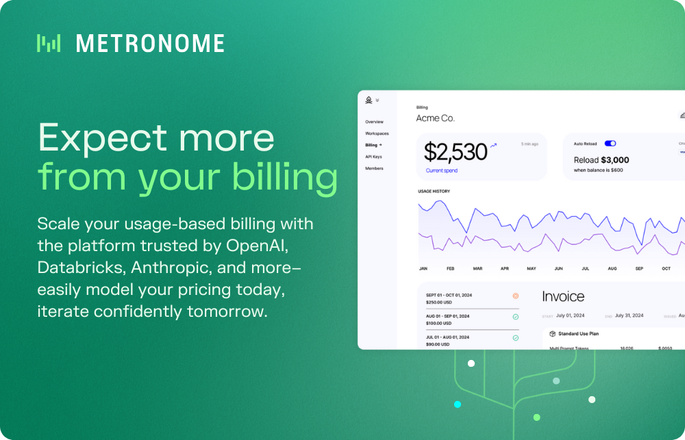 Software pricing models are moving from seats to usage with the proliferation of AI – don't get left behind. Metronome is a usage-based billing platform built to help companies launch and iterate pricing faster, give customers better control over spending, and drive strategic decisions with real-time insights. Learn about OpenAI's pricing playbook, or watch our on-demand webinar to see our product action.