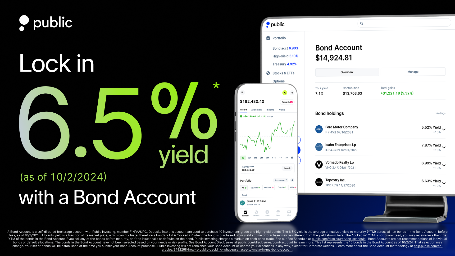 A Bond Account is a self-directed brokerage account with Public Investing, member FINRA/SIPC. Deposits into this account are used to purchase 10 investment-grade and high-yield bonds. The 6.6% yield is the average, annualized yield to worst (YTW) across all ten bonds in the Bond Account, before fees, as of 10/02/2024. A bond’s yield is a function of its market price, which can fluctuate; therefore a bond’s YTW is not “locked in” until the bond is purchased, and your yield at time of purchase may be different from the yield shown here. The “locked in” YTW is not guaranteed; you may receive less than the YTW of the bonds in the Bond Account if you sell any of the bonds before maturity or if the issuer defaults on the bond. Public Investing charges a markup on each bond trade. See our Fee Schedule
