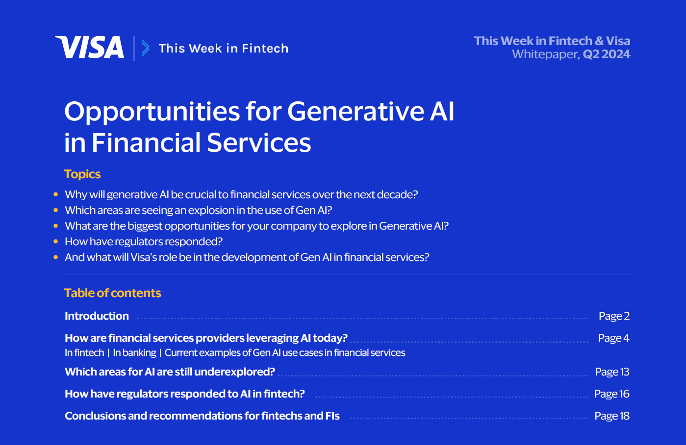1. As a special bonus read, we co-authored Opportunities for Generative AI in Financial Services with Visa last year. In the paper, we discuss the exciting emerging applications of generative artificial intelligence, evaluate how fintechs and banks are incorporating Gen AI differently, based on each of their relative strengths, and dig into areas for Gen AI that are still underexplored.