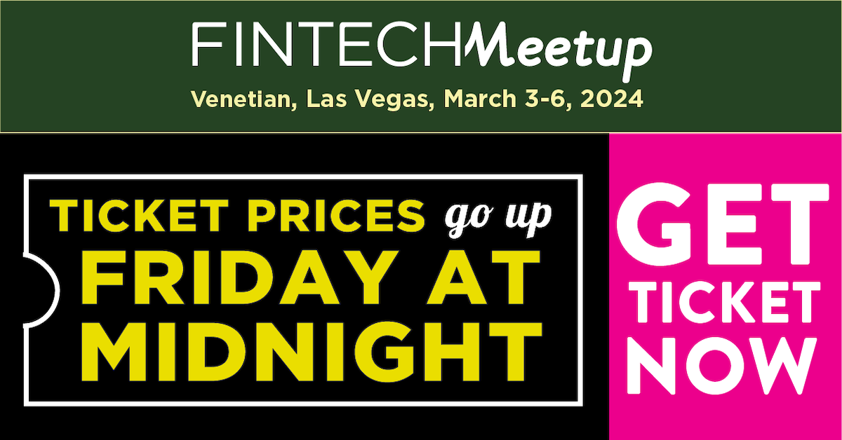 Fintech Meetup (March 3-6) is less than 60 days away!  Don’t miss Fintech’s new BIG show with “the highest ROI” for attendees & sponsors. Ticket prices go up Friday 1/12 at midnight. Don’t miss out.