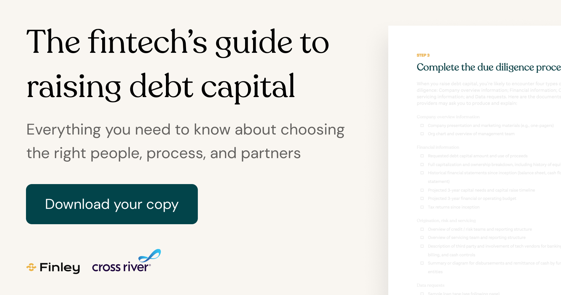 Raising debt capital is a crucial requirement for card, lending, and neobank startups, but most fintech operators don’t come from a capital markets background. That’s why Finley and Cross River Bank put together this comprehensive guide to raising debt capital. It outlines the people, processes, and partners you need to assemble to execute a debt capital raise. Download your free copy here.