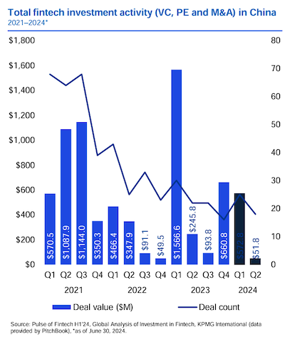Let's start with some good news: According to KPMG, fintech investments in China have begun to recover and China, including Hong Kong, accounts for half of the top ten fintech deals in APAC in the first half of 2024.