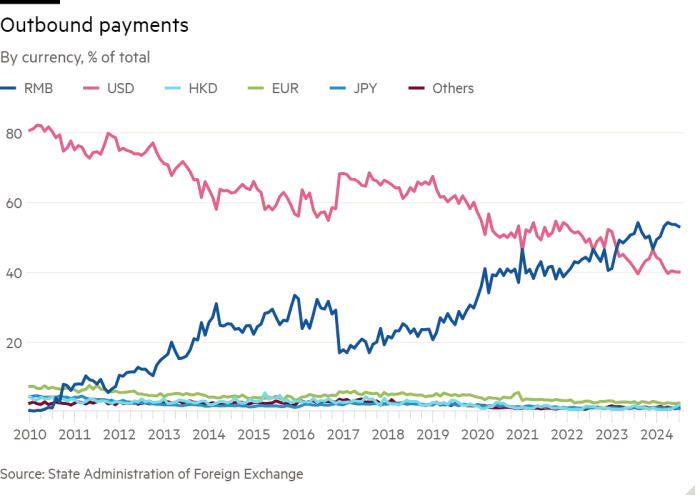 China’s use of the renminbi in cross-border transactions reached record highs this year, as it diversifies away from the dollar: