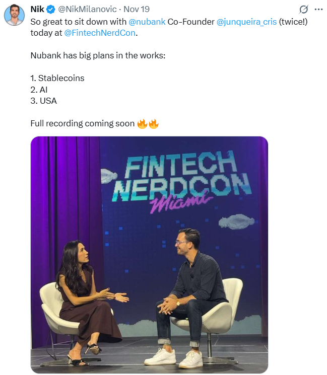 I'm just getting back from Fintech NerdCon, where I got to enjoy two days of packed programming built for fintech builders. I had a great conversation with Nubank co-founder Cristina Junqueira on their US strategy, their use of AI, and what role stablecoins will play for the bank. We'll share the full recording soon.