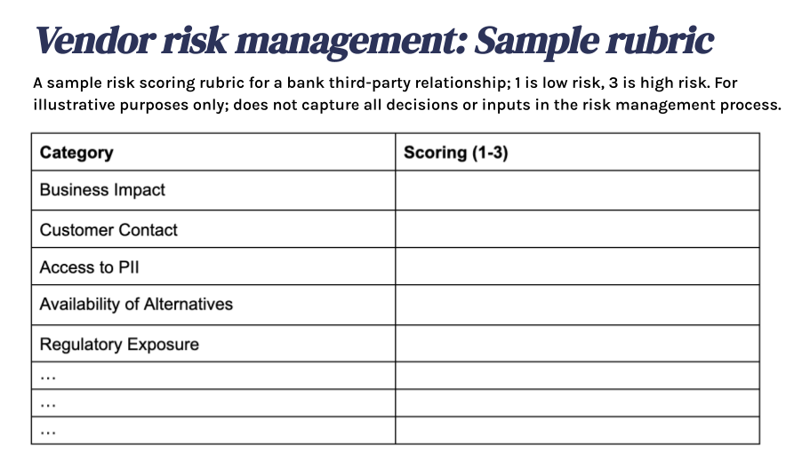 The bank can then use the documented expected impact and associated risks of the third party to determine the appropriate level of oversight and ongoing monitoring. In order to thoughtfully fill out the rubric, it might be necessary to ask subject matter experts to opine or build a review team that has expertise across the categories.