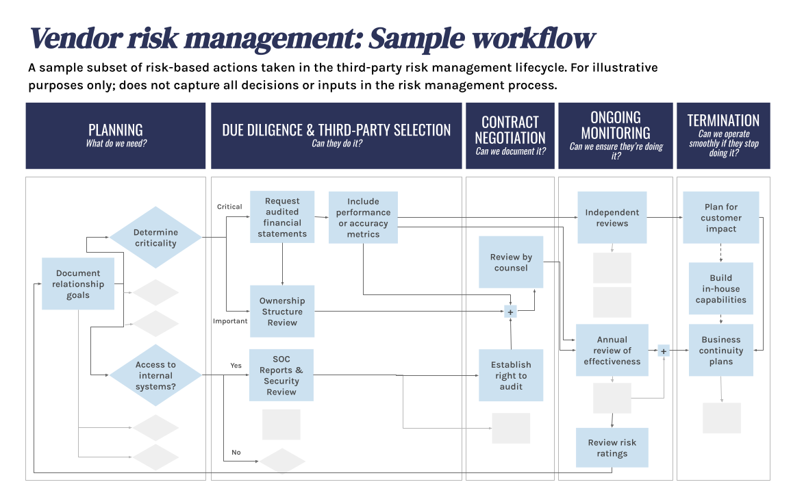 • Determining the appropriate actions to mitigate associated risks throughout the full relationship life cycle: Planning -> Due Diligence & Selection -> Contract Negotiation -> Ongoing Monitoring -> Termination.