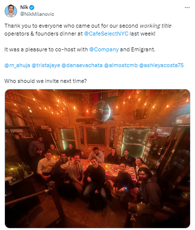 We hosted a great dinner last week in New York with our friends at Company Ventures and Emigrant Venture Partners. I can't wait for the next one – which great operators, rising stars, and new founders in NYC shoud we invite next?