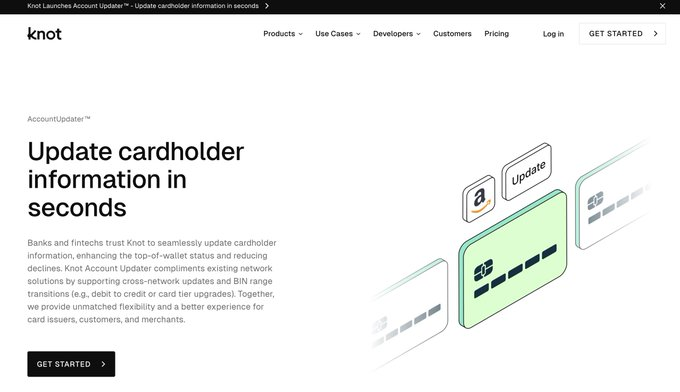 Knot launched AccountUpdater, which allows card issuers using CardSwitcher to update cardholder details (card info, name, address, phone) across Knot-connected merchants with a single API call, requiring no effort from the cardholder.