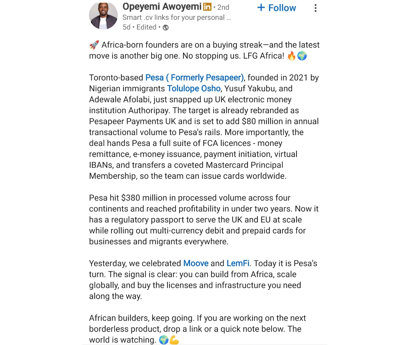 • Pesa acquired UK EMI, Authoripay Emoney to begin Europe expansion.