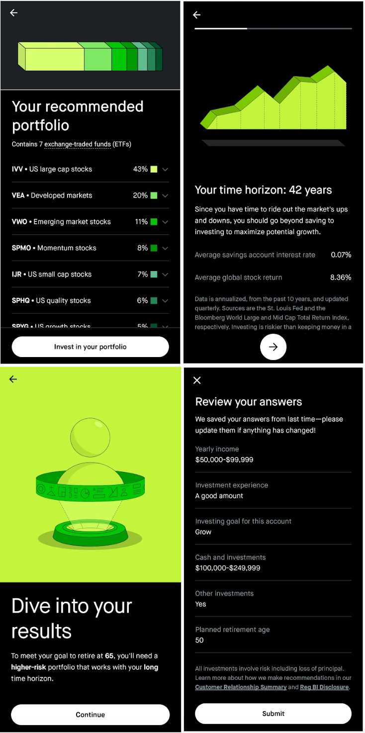 When Robinhood users open a Traditional or Roth IRA, they go through an onboarding process that helps them build a portfolio: