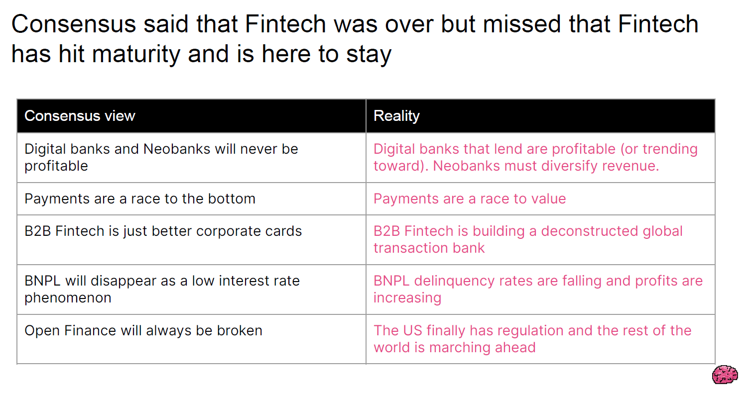 The narrative of 2023 was that fintech is overvalued, that it is uninvestable, that it is over. But in tech, once a perspective becomes the narrative, that means it is out of date.