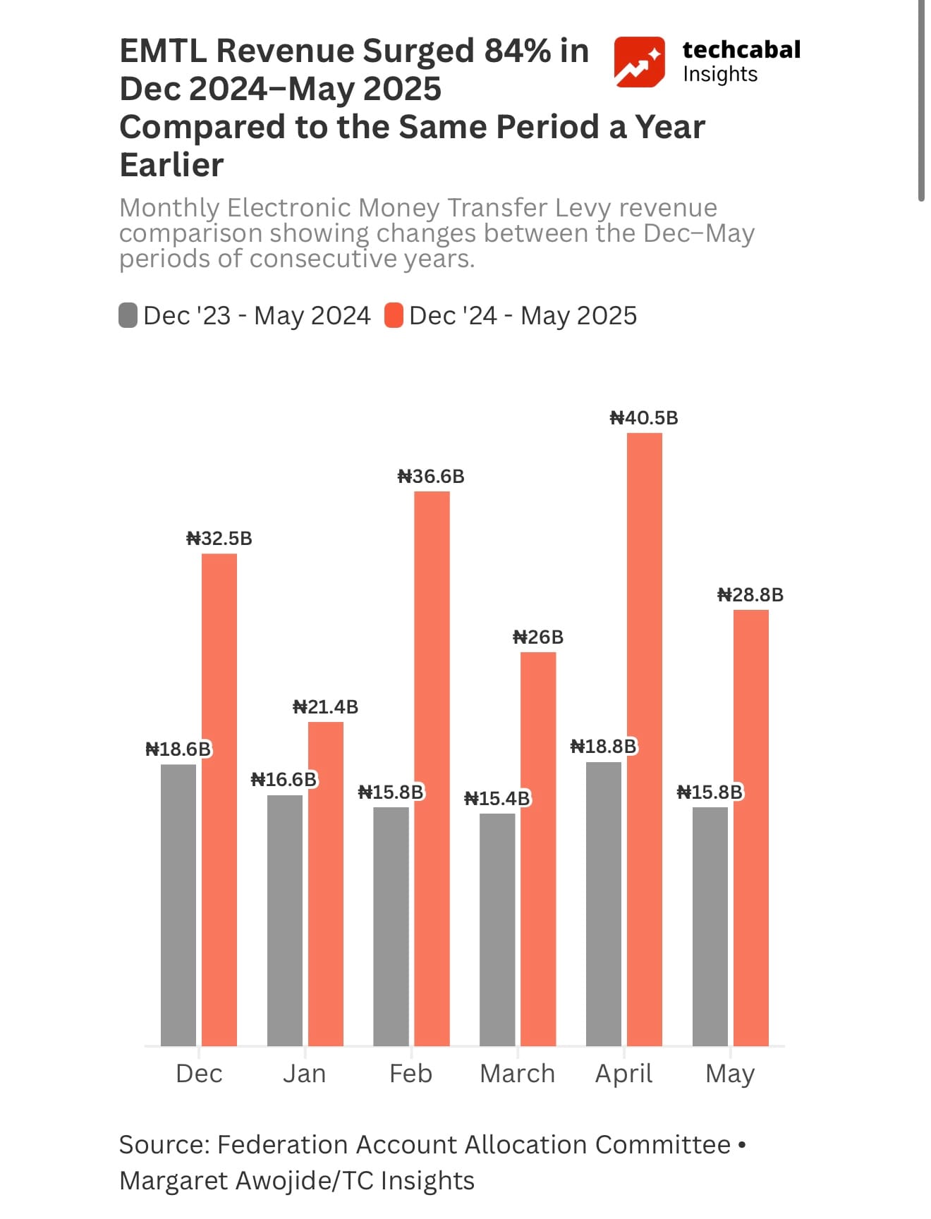 • Nigeria collected $55.5 Million(₦84.97)  in six months after adding the transfer levy to fintechs.