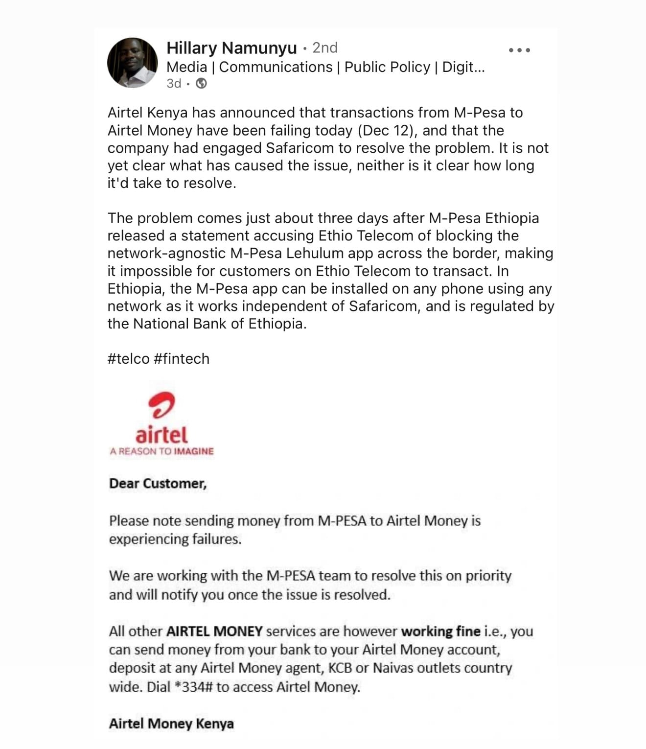 • Last week, M-Pesa complained that its app was blocked by a competitor in Ethiopia. Today, a similar situation is playing out but this time M-Pesa is the one accused of blocking a competitor in Kenya. What does this say about the future of mobile money competition in Africa?