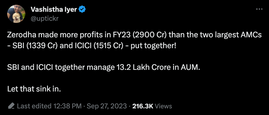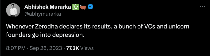1. Zerodha reported INR 6,500cr ($828mm) in revenue and INR 2,950cr ($349mm) in FY23 (ended Mar, 2023).