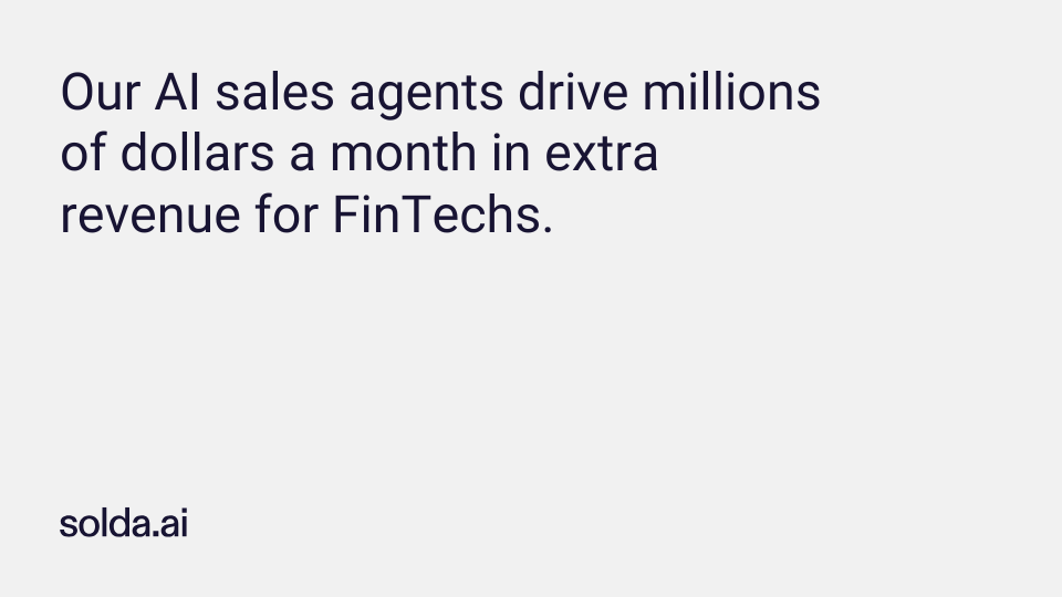 Solda AI has already replaced human sales agents at leading FinTech companies. Built for enterprises, we handle onboarding, upsell, cross-sell, KYC, and retention calls – scaling instantly. Solda.ai costs 40% less than human teams, yet outperforms them. Book a demo today.