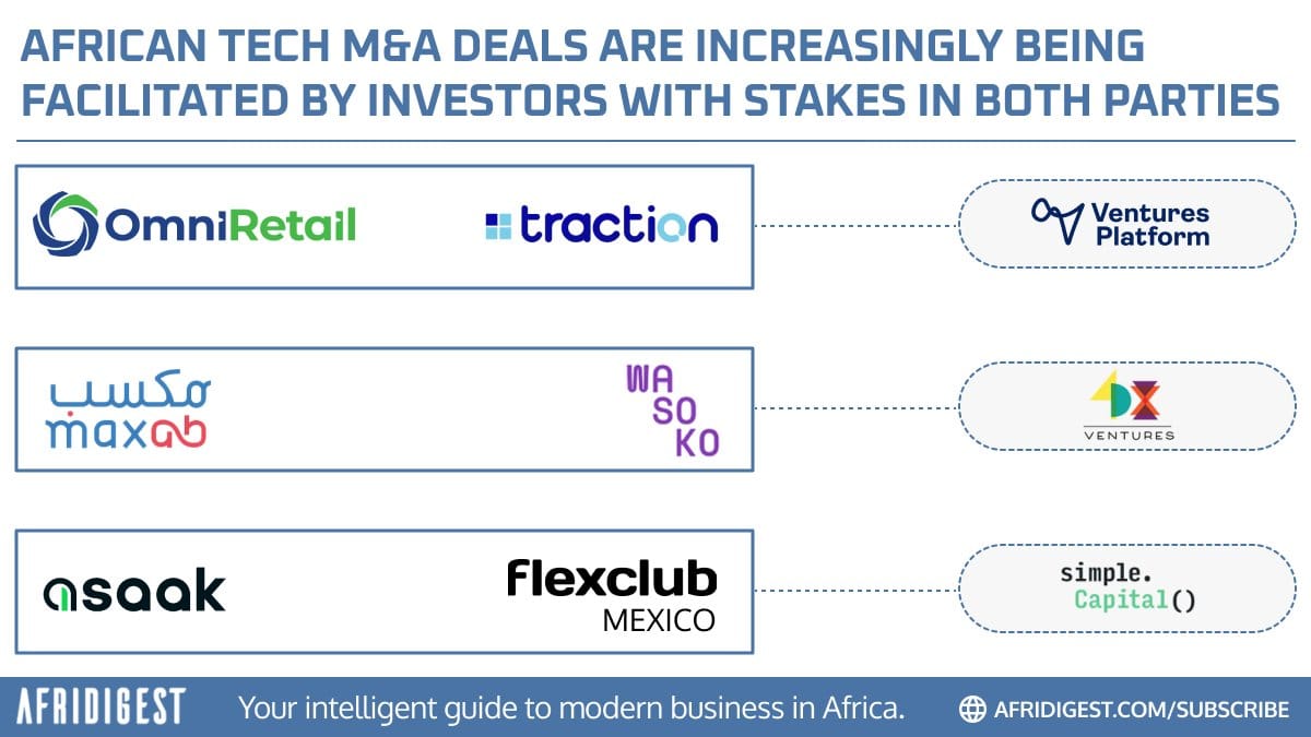 AFRICAN TECH M&A DEALS ARE INCREASINGLY BEING FACILITATED BY INVESTORS WITH STAKES IN BOTH PARTIES.