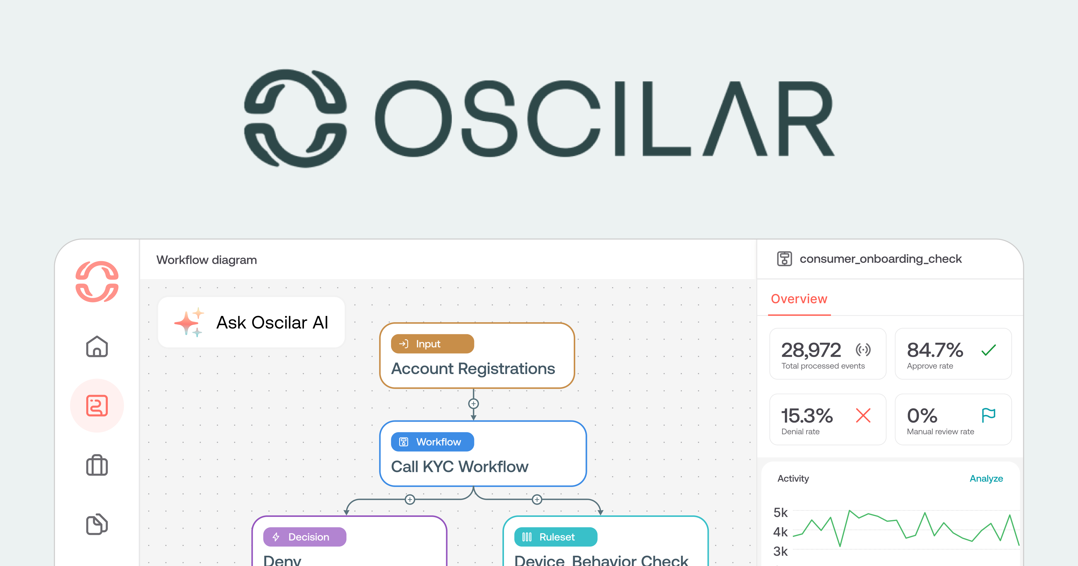 Oscilar is the first AI Risk Decisioning™ Platform to manage onboarding, fraud, credit, and compliance risk.