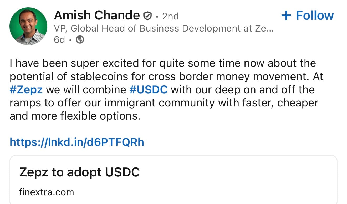 • Zepz to adopt USDC.