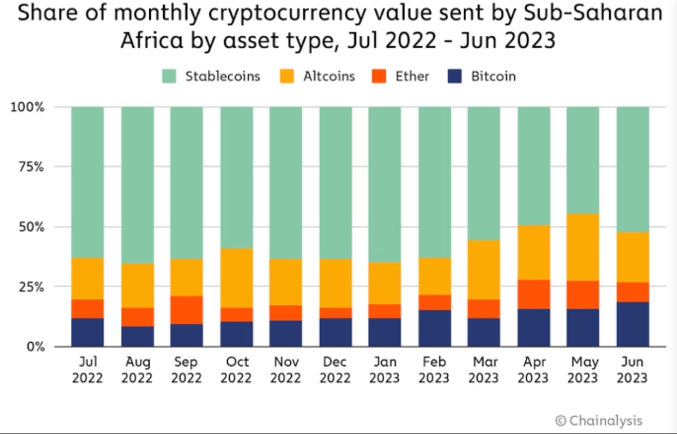 Share of monthly cryptocurrency value sent by Sub-Saharan Africa by asset;Jul 2022 - Jun 2023