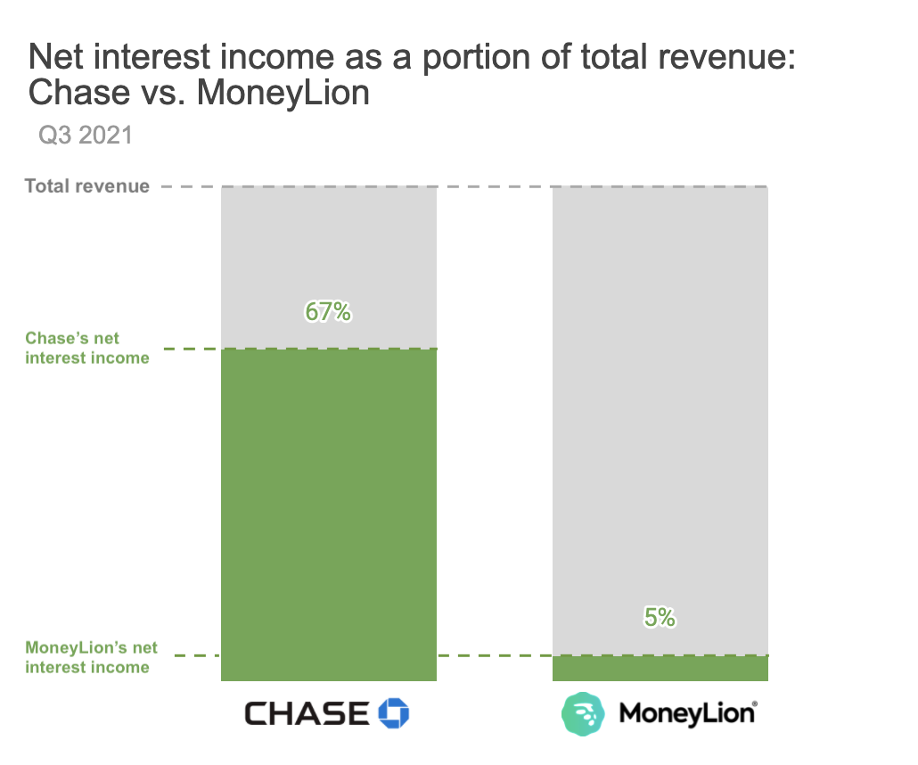 Neobanks operate on a different business model, primarily earning money from payment interchange and customer fees. Net interest income (NII) isn’t lucrative for neobanks because the activities that generate NII are only profitable if they’ve obtained a bank charter, which is– simply put– a huge pain in the ass. So neobanks like MoneyLion will wrap a partner bank that provides the underlying banking products through their own charter (in MoneyLion’s case, MetaBank). This helps neobanks avoid a lot of headache in getting to market but means that they miss out on net interest income, which is one of the largest revenue drivers in the traditional banking model.