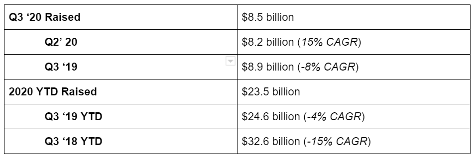 We tracked fintech fundraises by 186 companies across 37 different verticals in Q3. Here’s how the numbers stack up against prior periods: