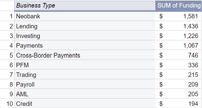 Neobanks commanded the highest share of funding at $1.6 billion, displacing Payments, and Lending saw surprising growth in fundraising, taking the #2 position with $1.4 billion raised. Investing and Payments platforms were the two other categories to raise 10 figures in Q3, with $1.2 billion and $1 billion raised respectively (most of the investing app volume comprised of Robinhood’s Series F and G).