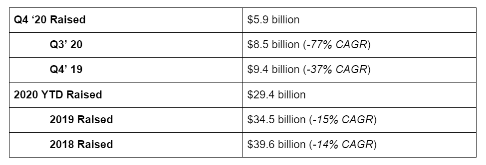 The number of fundraises saw a sharp uptick in Q4 of last year - up 13% from 186 rounds in Q3 ‘20 to 211 funding events in Q4 - in a quarter normally marked by dead periods during the holidays.
