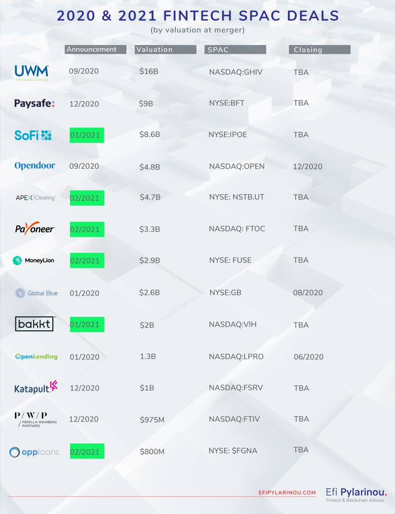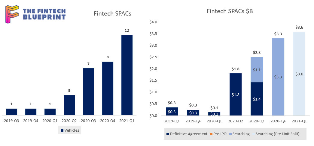 (Note: For those who haven’t read it, Lex Sokolin over at Fintech Blueprint also wrote a great overview of fintech SPAC activity, with coverage of MoneyLion’s recent entry into the public markets. He accounts a little differently for the number of fintech-focused SPACs, as seen below.)