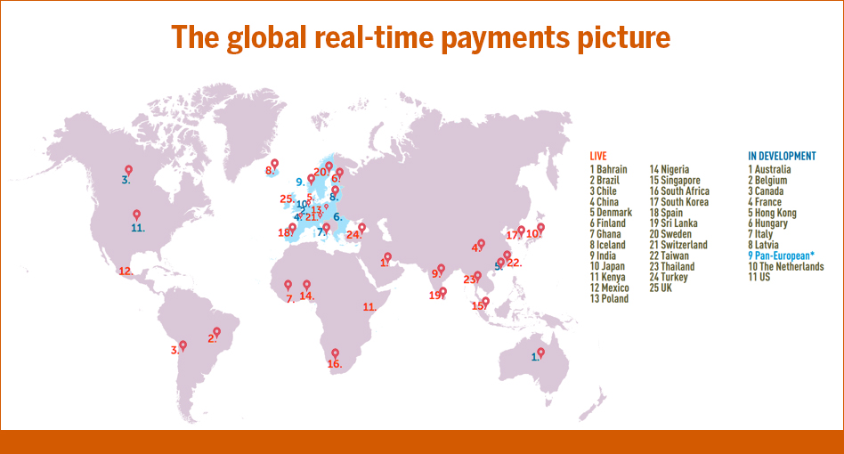 A map of live real-time payment infrastructures globally, now including Iceland and Brazil.