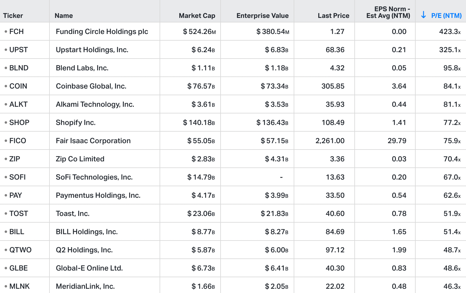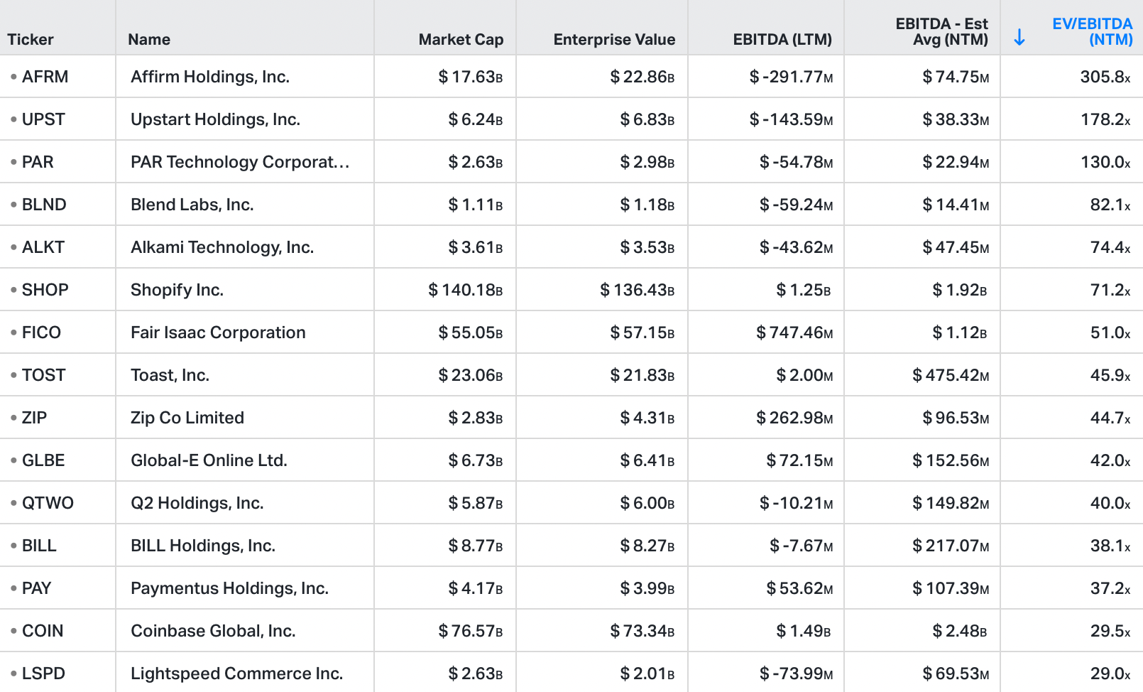 These are also some of the most expensive fintech stocks on the EV/EBITDA or P/E multiples (see the tables at the bottom of this email). This suggests that the market, most likely, values Shopify, Toast, and Bill as software companies, rather than as fintech companies. It doesn't matter that the majority of revenue (and a large share of gross profit) comes from financial services, the market seems to value the software part of these businesses. I would think there is some learning in this for the up-and-coming fintech companies.