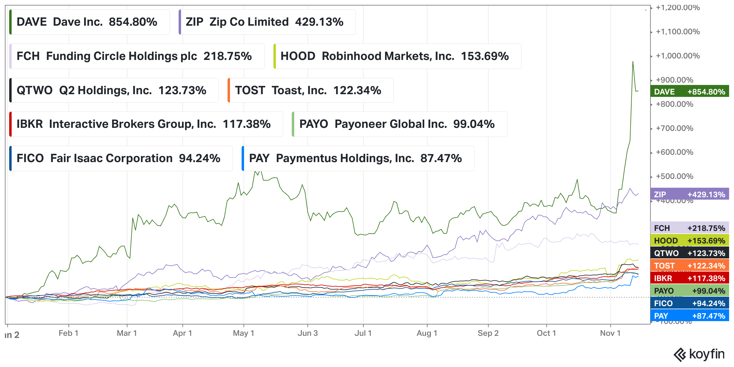 As of this writing, Sezzle (NASDAQ: SEZL) is up 1,776% YTD. I had to exclude Sezzle from the chart, as it made all others look like ridiculous underperformers, which obviously isn't true. To get into the Top 10 best-performing fintech stocks, a stock's price needed to (almost) double.