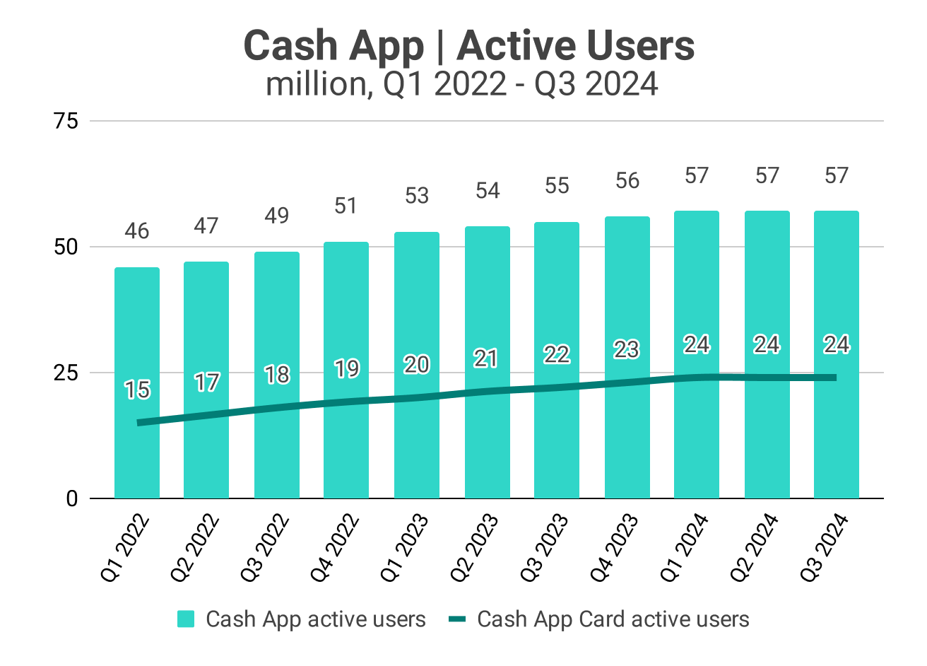 Cash App has been a growth driver for Block, offsetting growth deceleration in Square's business. However, Cash App, at least with its current value proposition, is clearly reaching the limits of its target market. The number of monthly active users on Cash App leveled off at approximately 57 million, while the number of active Cash App Card users stabilized at 24 million (see the chart below). In Q3 2024, inflows per active user were $1,233, up 9% YoY (and flat QoQ). Total inflows were $70 billion, up 13% YoY (and down 1.4% QoQ).
