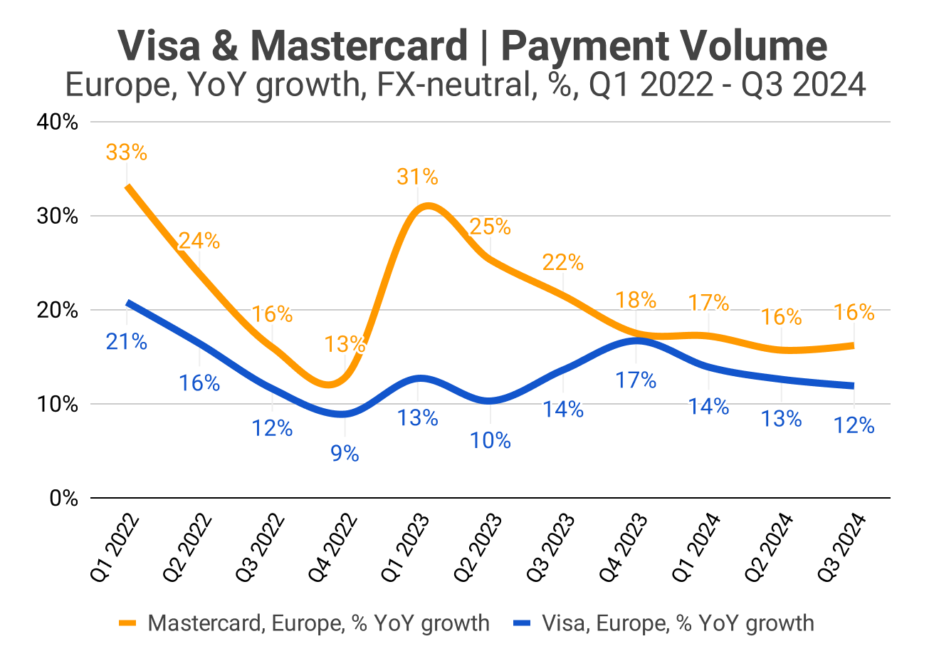 What's happening in Europe is way more interesting. In Q3 2024, the EU economy grew 0.3% YoY (compared to 2.8% for the U.S.). However, both Visa and Mastercard still delivered double-digit growth in European payment volume. According to comments from the earnings calls, many European countries are still going through a secular shift from cash to digital payments, which benefits both Mastercard and Visa. Moreover, both are winning business from local card schemes (e.g. girocard in Germany or Cartes Bancaires in France).