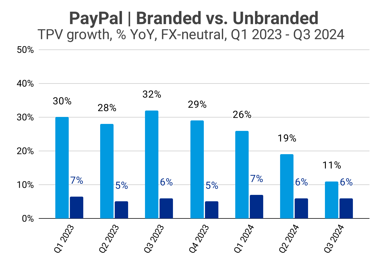A year ago, Alex Chriss, PayPal's new CEO, set a goal to shift the company toward "profitable growth." One of his immediate focus areas was Braintree (reported as "unbranded" processing). It was widely believed that Braintree's rapid growth, comparable to competitors like Stripe and Adyen, was driven by PayPal pricing its services below cost to boost revenue. In Q3 2024, Braintree's payment volume grew 11% YoY, a sharp deceleration from 32% YoY a year ago (see the chart below).
