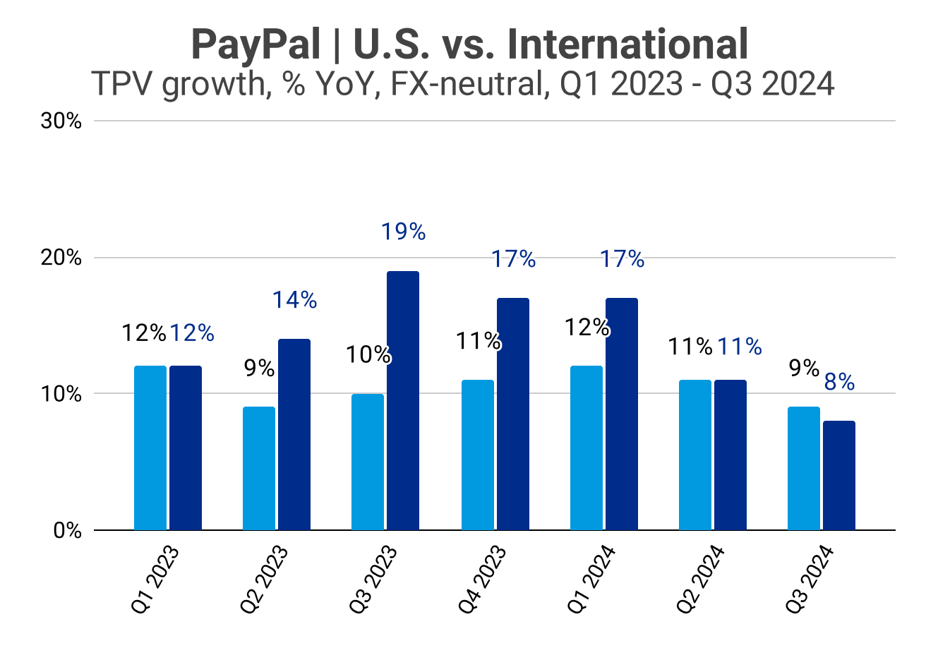 PayPal has "accepted a lower near-term Braintree revenue profile in exchange for better margins", as per the company's Chief Financial Officer, Jamie Miller. The company's management also expects "lower Braintree volume and revenue growth in the fourth quarter and through 2025." However, it seems that Braintree is not the only area that is impacted. Thus, international volume growth has also decelerated to 8% YoY in Q3 2024, down from 19% YoY in Q3 2023 (on a currency-neutral basis). The pivot to profitable growth is killing two key growth drivers.