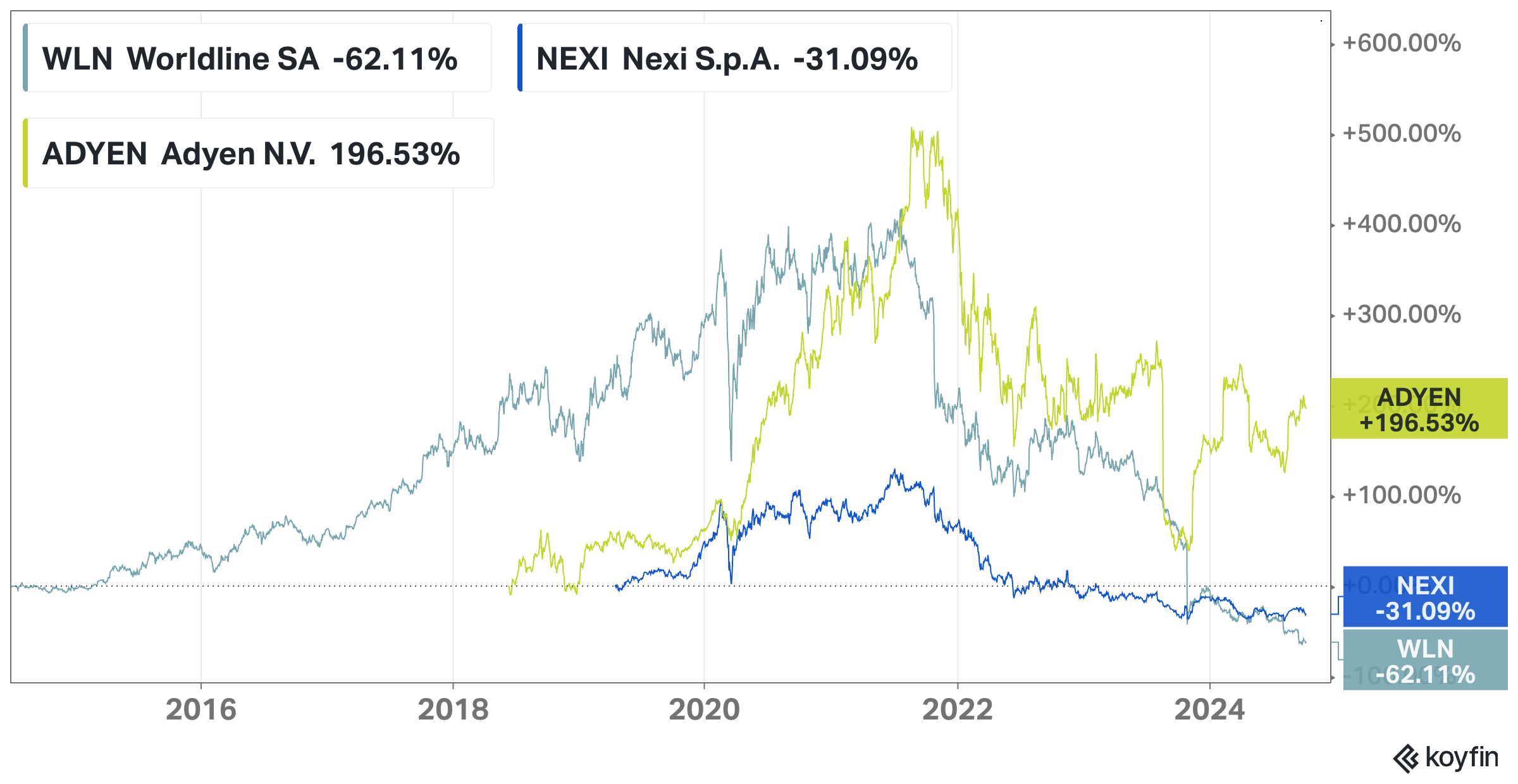 Worldline's rival, Nexi, isn't fairing better. The company is, so far, delivering on its 2024 guidance, but this guidance is just a fraction of what was promised during the company's 2022 Investor Day. The company's stock is down 21% YTD and is trading below the IPO price. In 2021, Nexi completed the merger with its Nordics rival, Nets, creating one of the largest merchant acquirers in Europe. This marked the peak for the company's stock.