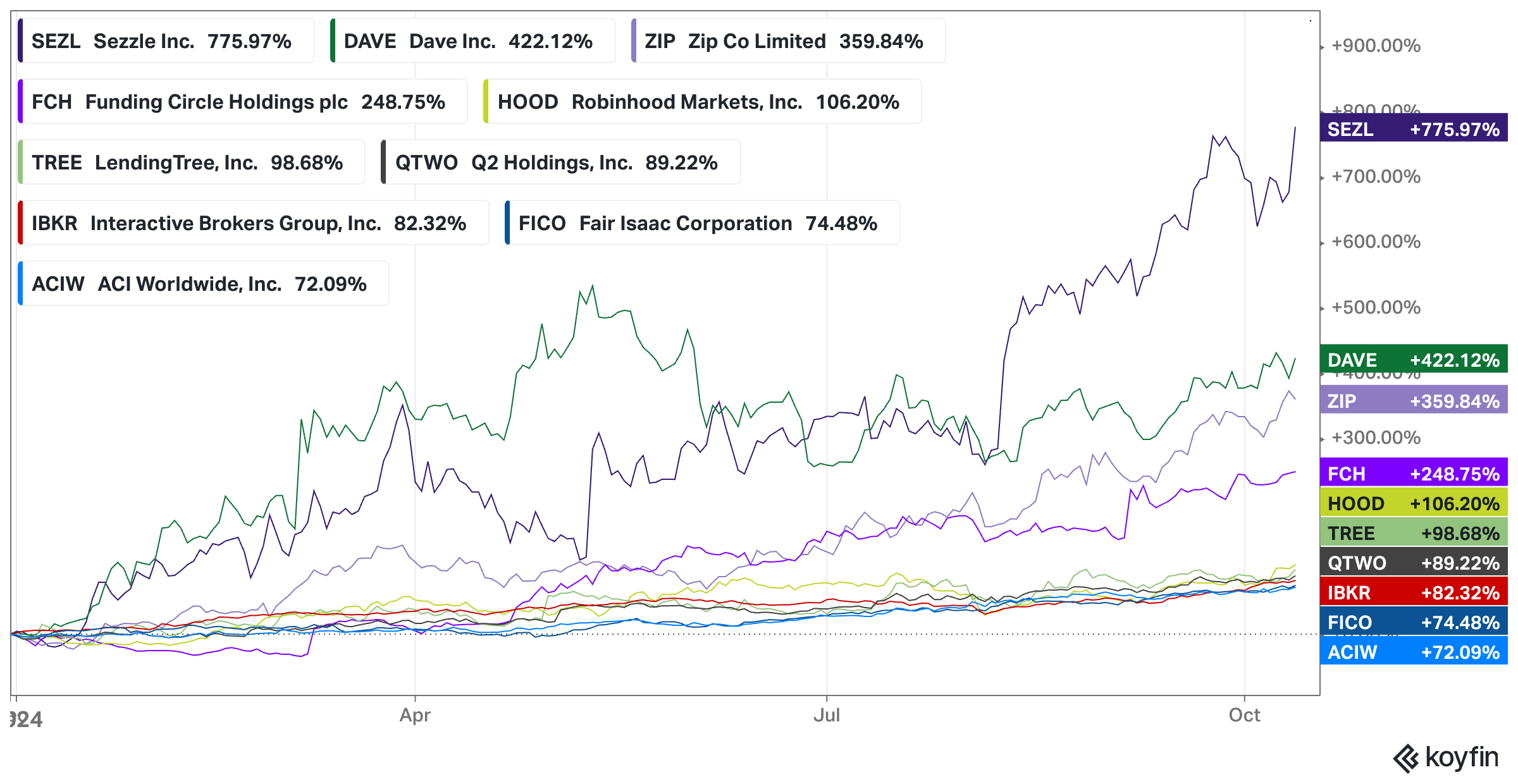Sezzle (NASDAQ: SEZL), Dave (NASDAQ: DAVE), and ZIP (ASX: ZIP) continued their run in September. Sezzle is now up 775% YTD, Dave is up 422% YTD and Zip is up 359% YTD. These numbers are getting ridiculous, so let's see for how long this run continues.