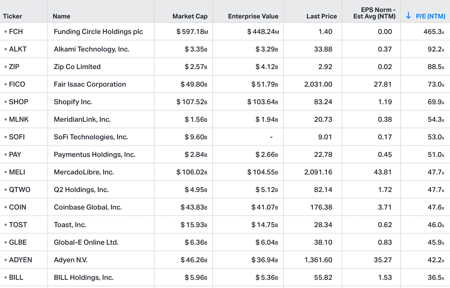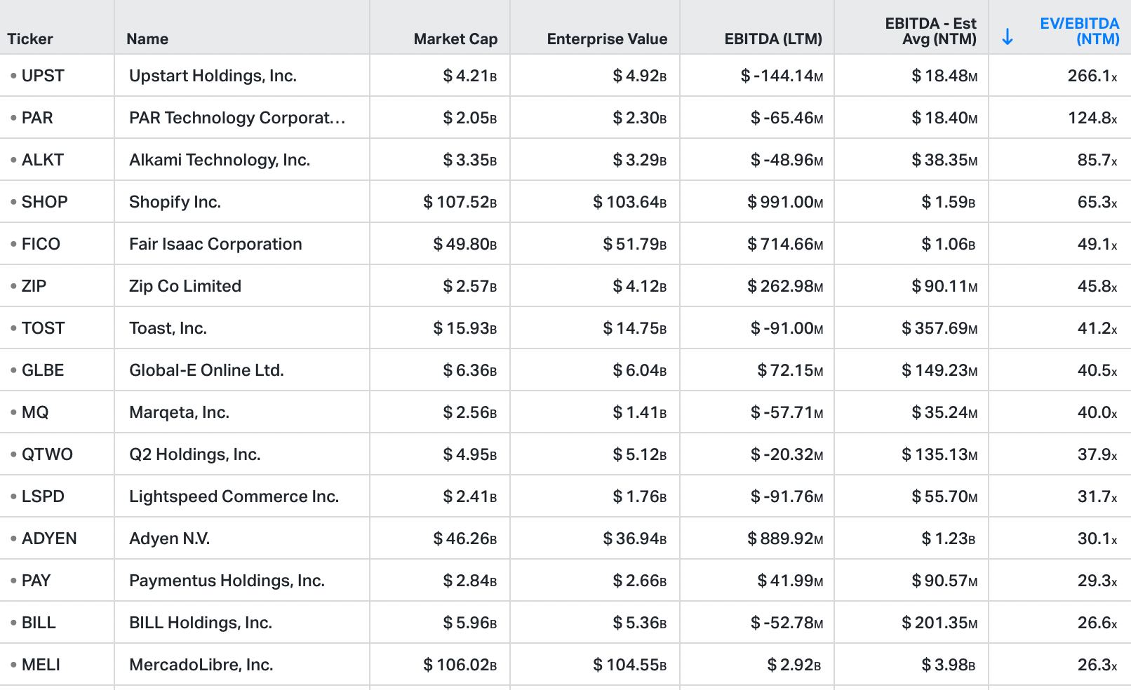 There weren't many changes to the lists of fintech companies ranked by their EV/EBITDA and P/E multiples since our previous issue: Shopify, Toast, and FICO are still some of the priciest fintech companies out there whichever way you look at them.